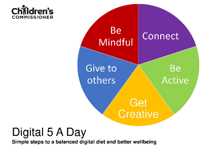 Please do not worry too much about screen time – think instead about screen quality, balance and mental health. The Children’s Commissioner has provided a framework called the ‘Digital Five a Day’ with five things to think about each day to help put that into practice.