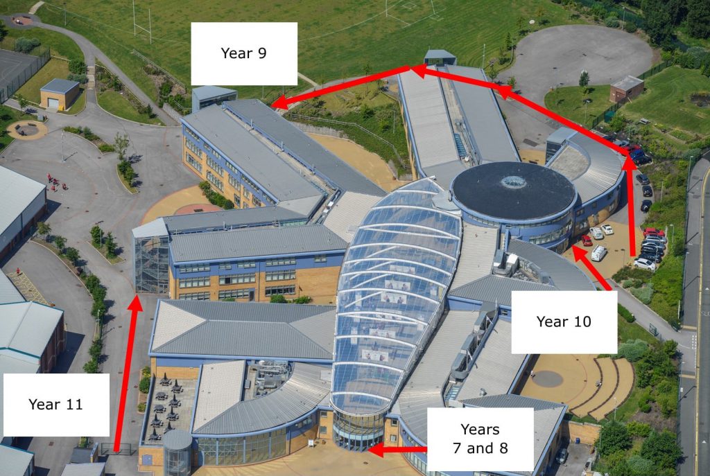 Year 11 Entrance: Gates down side of new sports hall --> Fire Escape Staircase to 3B (Science)