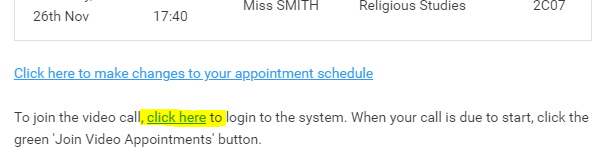 Parents who have booked appointments should check their email for their “Appointments Reminder” email, scroll to the bottom of the email and click the “click here to login” link. All you need to do then is enter your child’s date of birth to be logged in. (see example below)